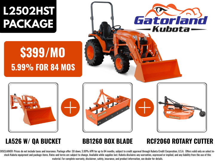 *Prices do not include taxes and insurance. Package offer: $0 down, 5.99% A.P.R. for up to 84 months, subject to credit approval through Kubota Credit Corporation, U.S.A. Offers valid only on select in-stock Kubota equipment and package items. Rates and terms are subject to change. Available while supplies last. Kubota disclaims any warranties, expressed or implied, and any liability from the use of this material. For complete warranty, disclaimer, safety, insurance, and product information, see dealer for details.